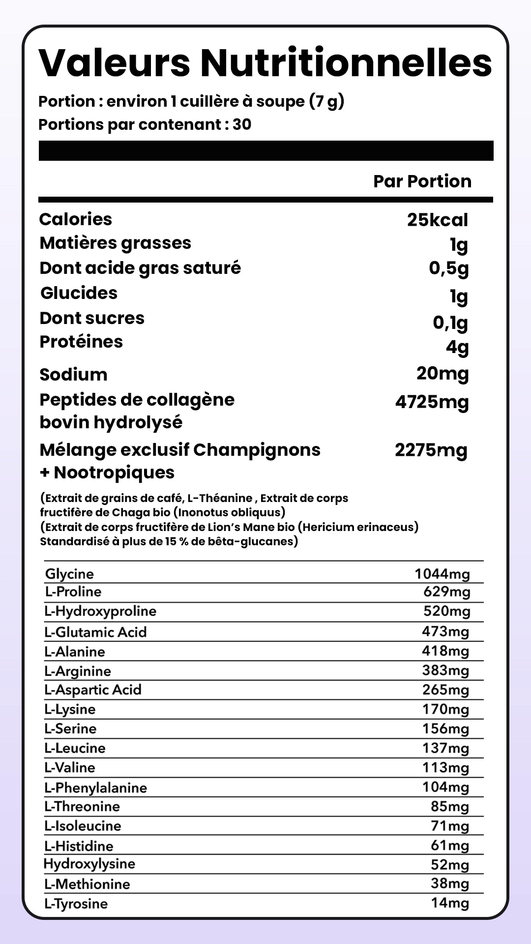 Une tasse de La Dose contient environ 35 mg de caféine, soit la moitié de la quantité contenue dans une tasse de café ordinaire. Afin de soutenir votre énergie de façon naturelle tout en éliminant les effets négatifs de la caféine, nous nous appuyons sur des champignons adaptogènes tels Lion's Mane.